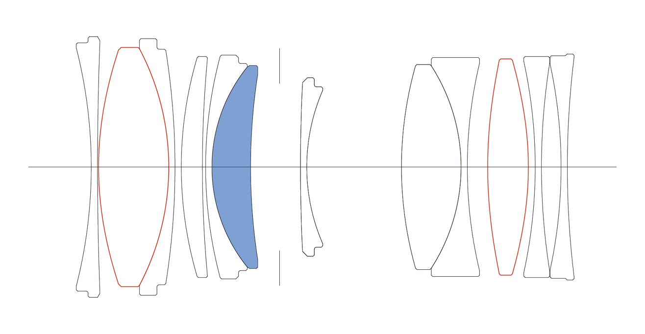 Objektivkonstruktion: 12 Elemente in 9 Gruppen, mit 1 SLD Glas und 2 asphärischen Linsen