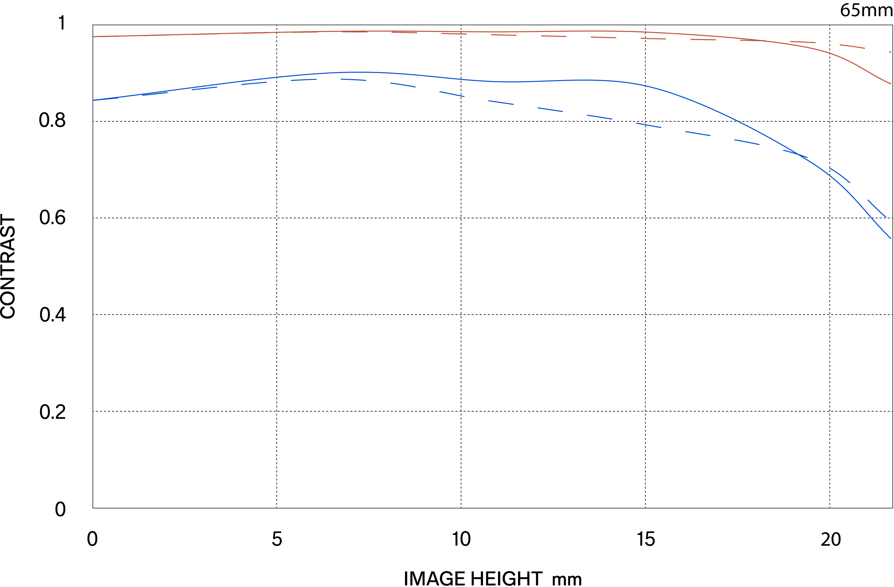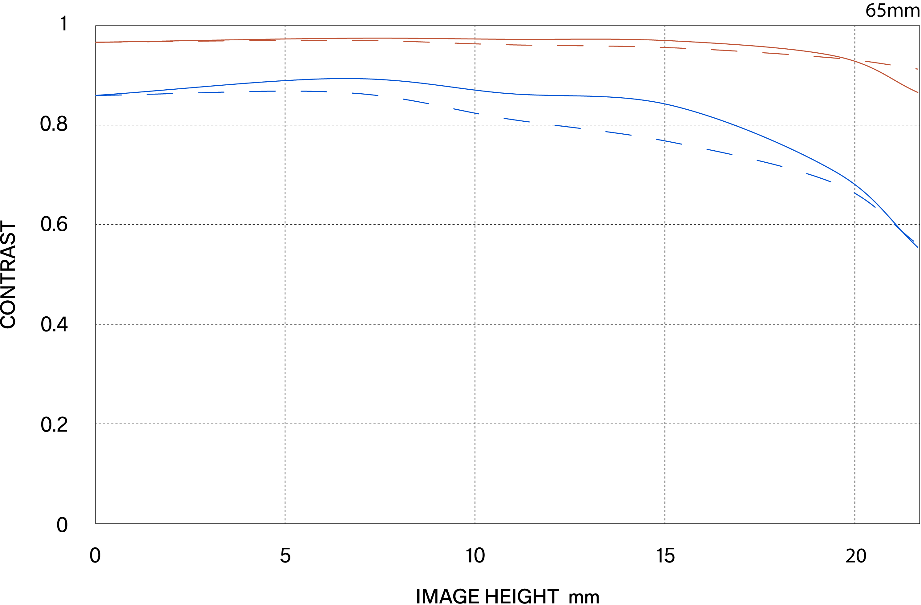 Die MTF (Modulation Transfer Function) ist eine der Messgrößen zur Bewertung der Objektivleistung. Sie zeigt, wie originalgetreu der Kontrast des Motivs auf der Bildebene wiedergegeben werden kann. Die horizontale Achse zeigt die Bildhöhe (Abstand von der Bildmitte in mm), die vertikale Achse den Kontrastwert (der Höchstwert beträgt 1).