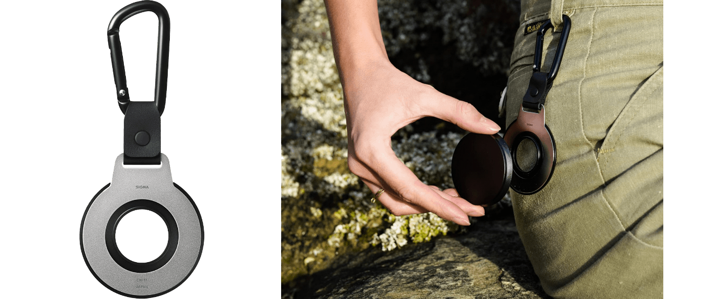Wenn ein Objektivdeckel vom Objektiv entfernt wird, sollte er einen geeigneten Platz zur Aufbewahrung haben. Ausgehend von diesem Gedanken wurde ein Objektivdeckelhalter entwickelt, der die magnetische Kraft des speziellen Deckels nutzt. Mit dem Deckel an der Ringplatte befestigt und diese an einer Tasche oder einem Gürtel angeclipst, ist der Deckel stets griffbereit und geht nicht so leicht verloren. Zudem ist sein elegantes Design eine stilvolle Ergänzung zur Ausrüstung eines Fotografen.