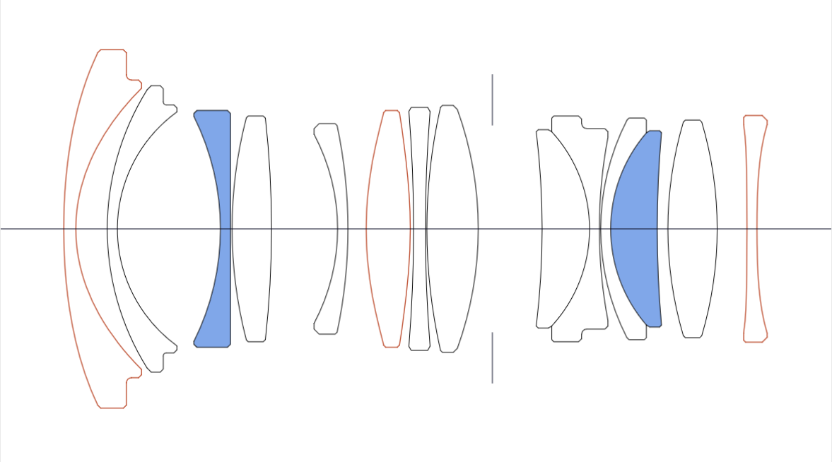 | Optischer Aufbau (Linsen/Gruppen) | 14 Elemente in 12 Gruppen ( 2 SLD) | |