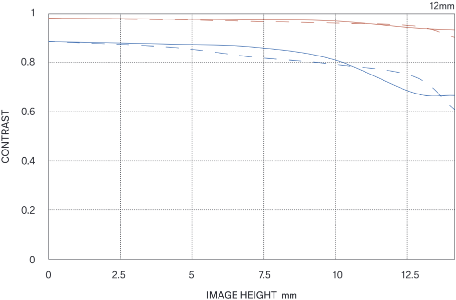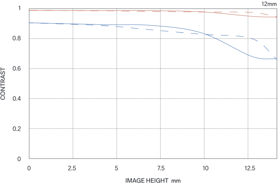 Die MTF (Modulation Transfer Function) ist eine Messgröße zur Beurteilung der Leistungsfähigkeit eines Objektivs. Sie zeigt, wie originalgetreu der Kontrast des Motivs auf der Bildebene wiedergegeben werden kann. Auf der horizontalen Achse ist die Bildhöhe (Abstand vom Bildzentrum in mm) dargestellt, auf der vertikalen Achse der Kontrastwert (Maximalwert = 1).
