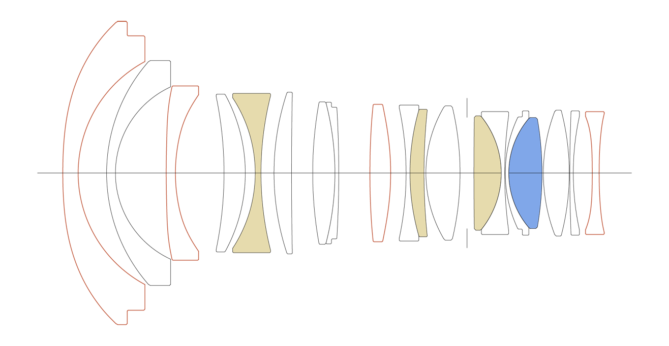 Objektivkonstruktion: 19 Elemente in 15 Gruppen (3 FLD, 1 SLD, und 4 asphärische Elemente)