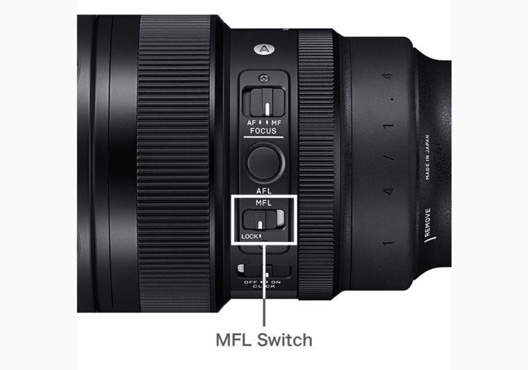 Der MFL-Schalter (Manual Focus Lock) trennt den Fokussierring vom Objektiv. Nachdem das Objektiv manuell auf die gewünschte Position fokussiert wurde, kann der MFL-Schalter auf „LOCK“ gestellt werden, um den Fokussierring zu deaktivieren.