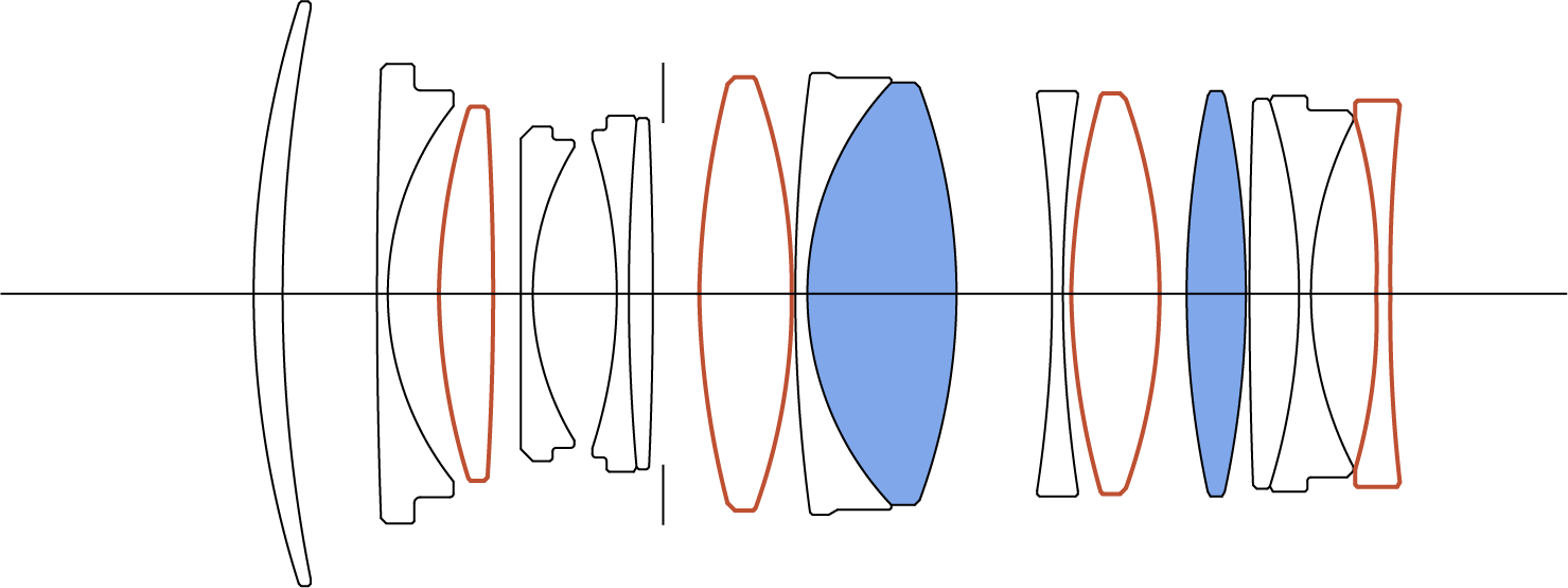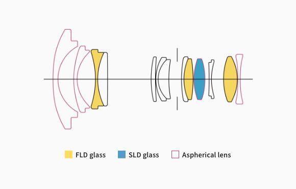 Der Einsatz einer asphärischen Linse mit großer Exzentrizität und hohem Brechungsindex als vorderstes Linsenelement ermöglicht eine Objektivkonstruktion mit reduzierter Anzahl an Elementen. In Kombination mit mehreren asphärischen Linsen und speziellem Glas mit niedriger Dispersion kann das Objektiv hochauflösende Bilder erzeugen und bleibt dennoch kompakt und leicht.
