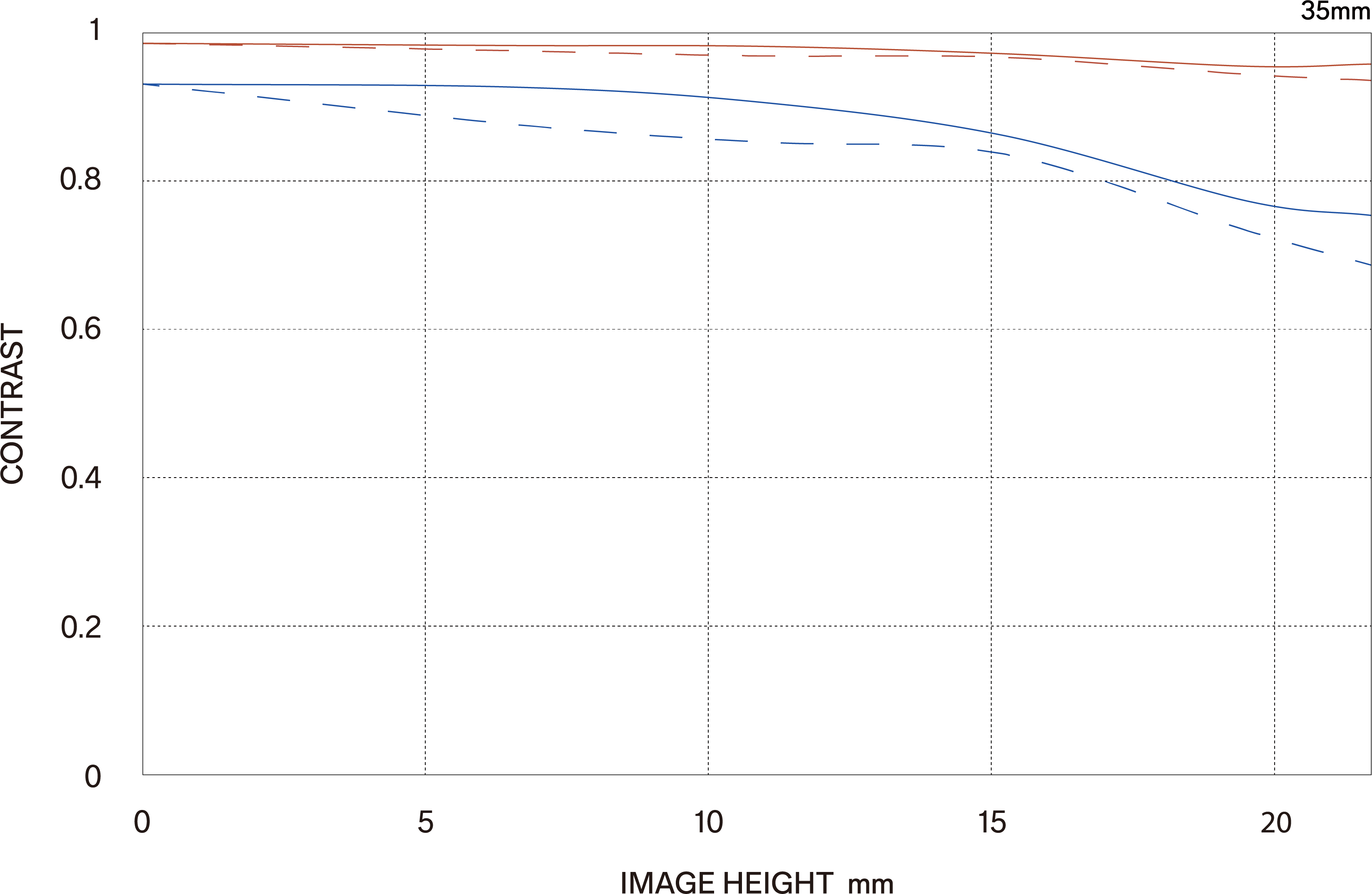 Die Messungen bei 10 Linien pro Millimeter zeigen die Kontrastfähigkeit des Objektivs (rote Linien), während feine parallele Linien mit einem Abstand von 30 Linien pro Millimeter die Schärfefähigkeit des Objektivs messen (grüne Linien), wenn die Blende vollständig geöffnet ist.