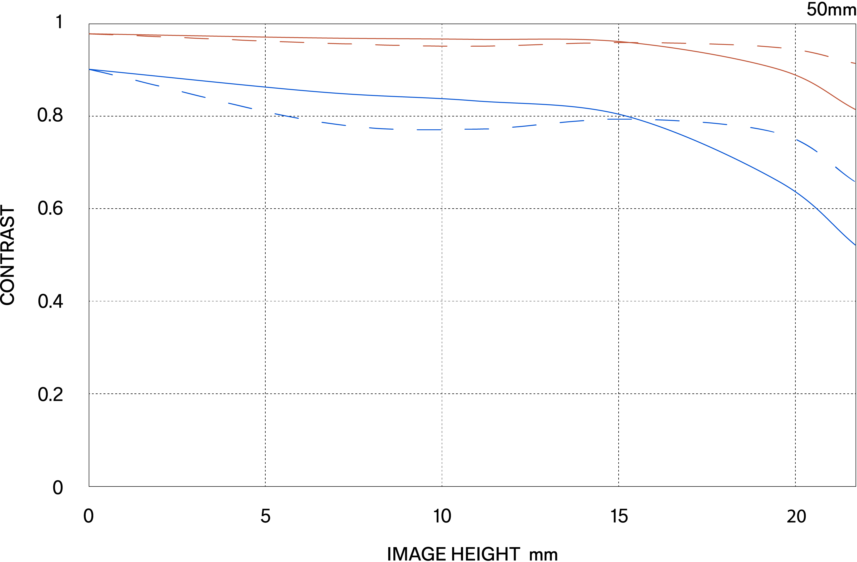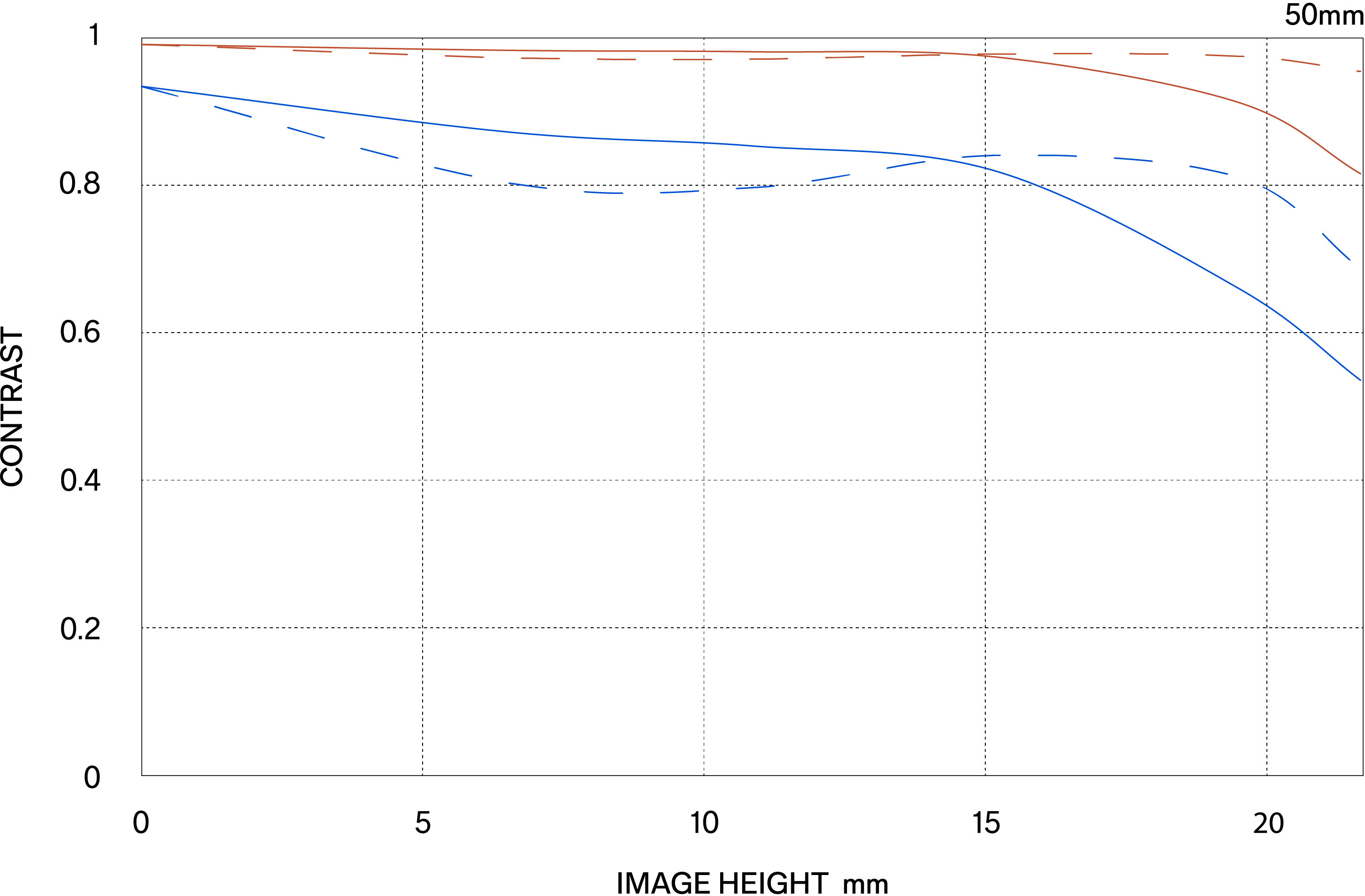 Die MTF (Modulation Transfer Function) ist eine Messgröße zur Bewertung der Abbildungsleistung eines Objektivs. Sie zeigt, wie originalgetreu der Kontrast des Motivs auf der Bildebene wiedergegeben werden kann. Die horizontale Achse gibt die Bildhöhe an (Abstand vom Bildzentrum in Millimetern), während die vertikale Achse den Kontrastwert darstellt (Maximalwert = 1).
